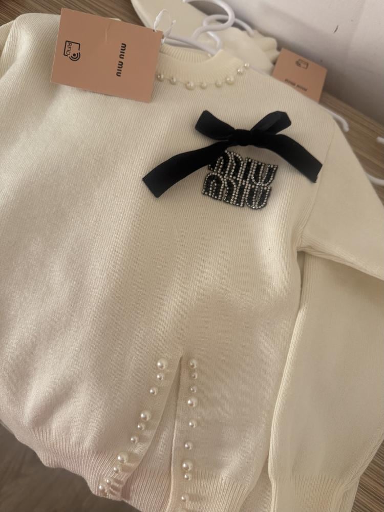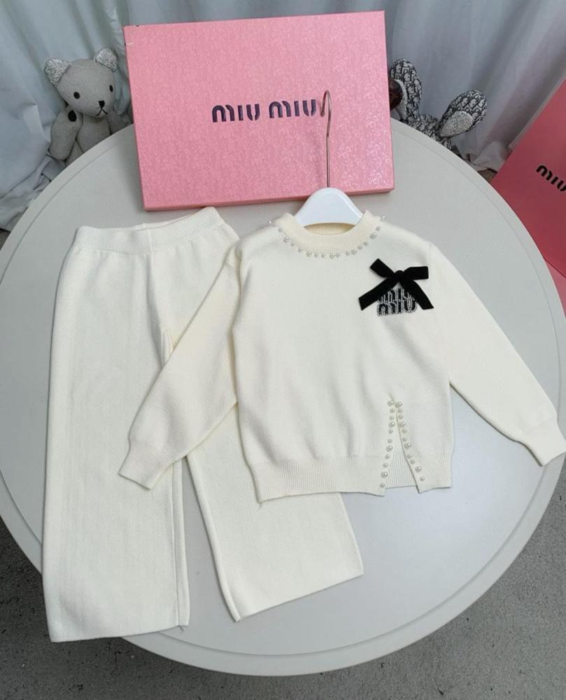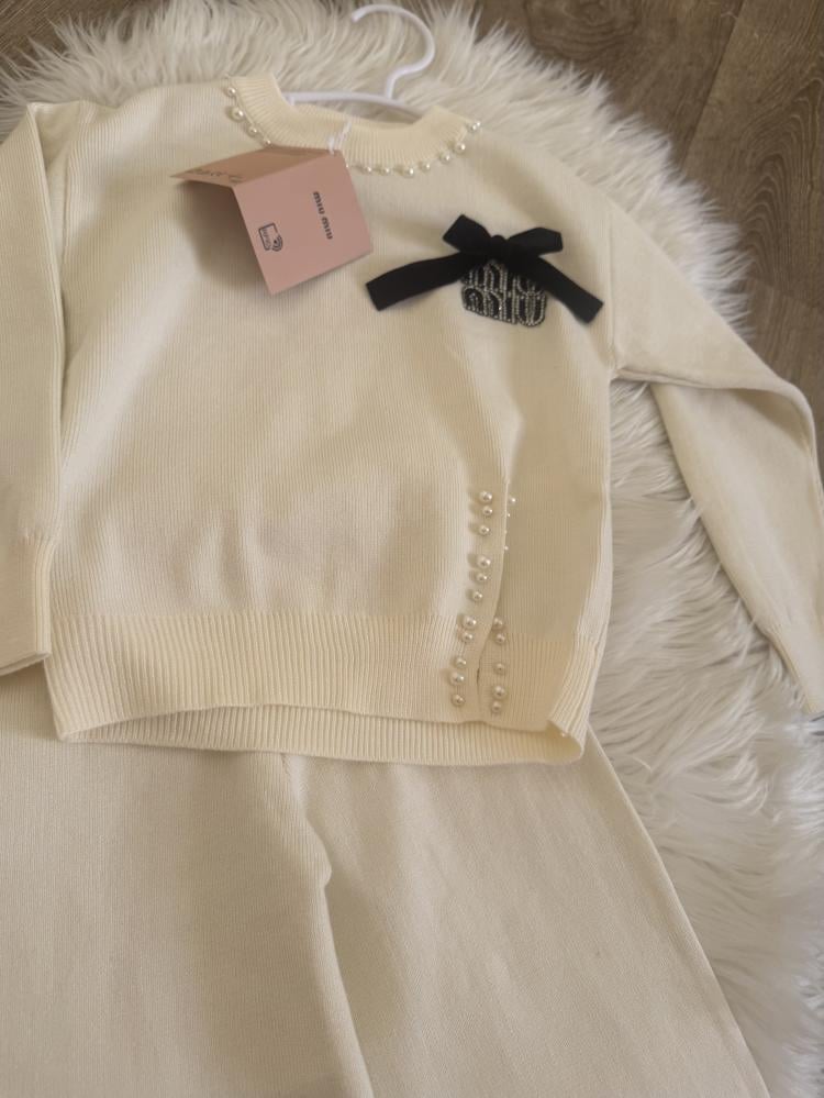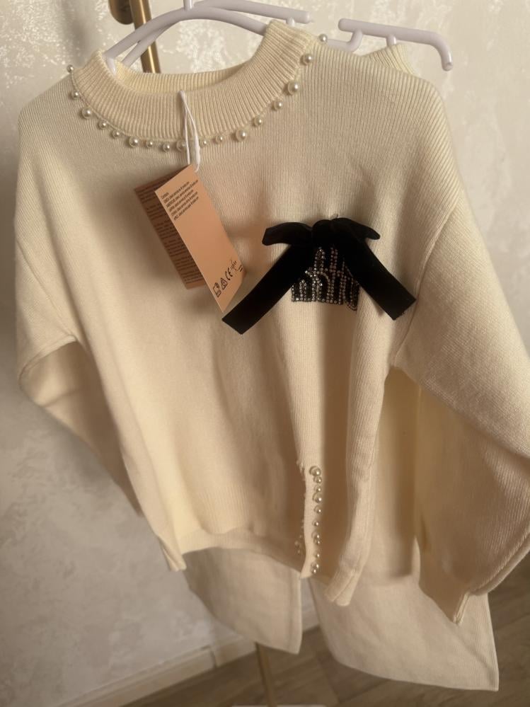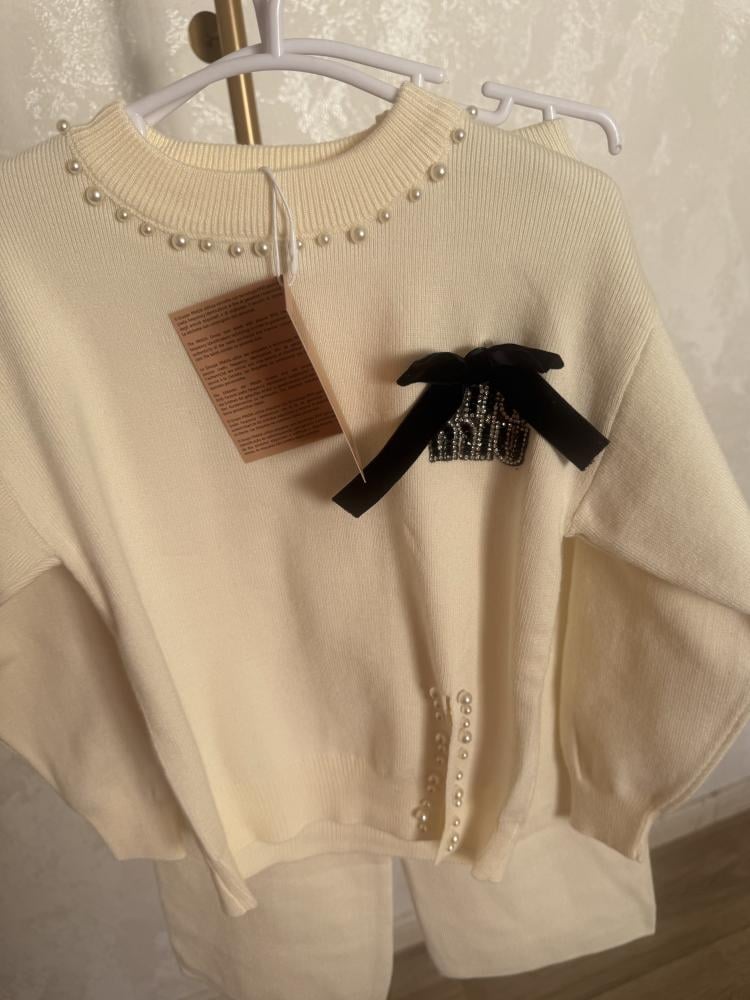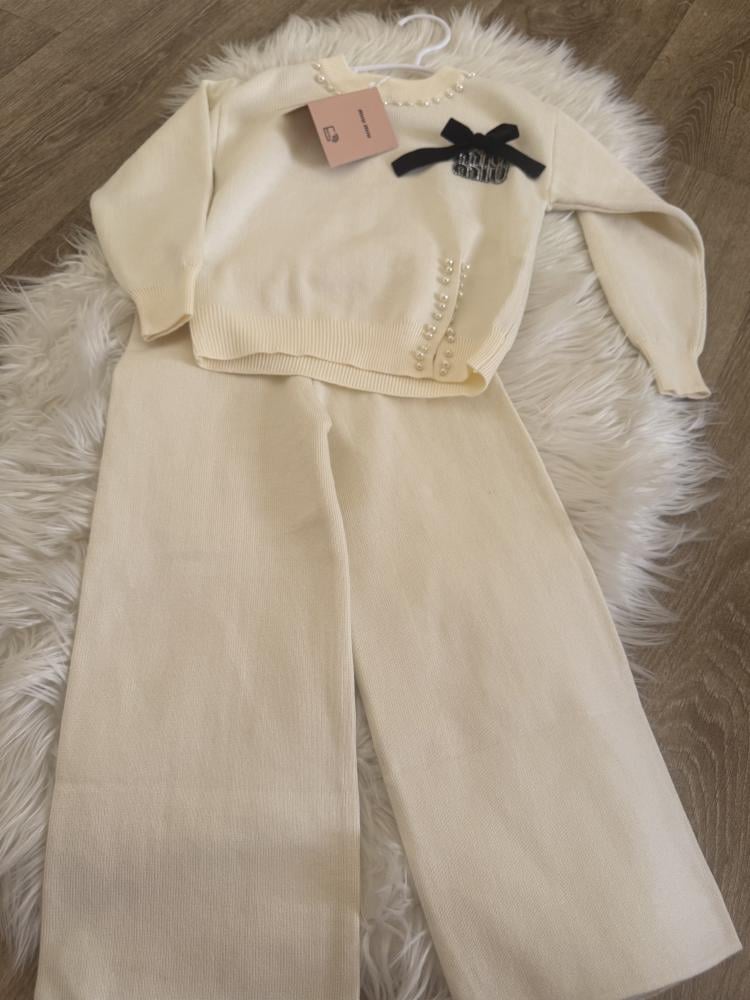 طقم مكون من مقطعتين بلوفر+بنطلون صوف مزين بلؤلؤ وشريطة مخمل
