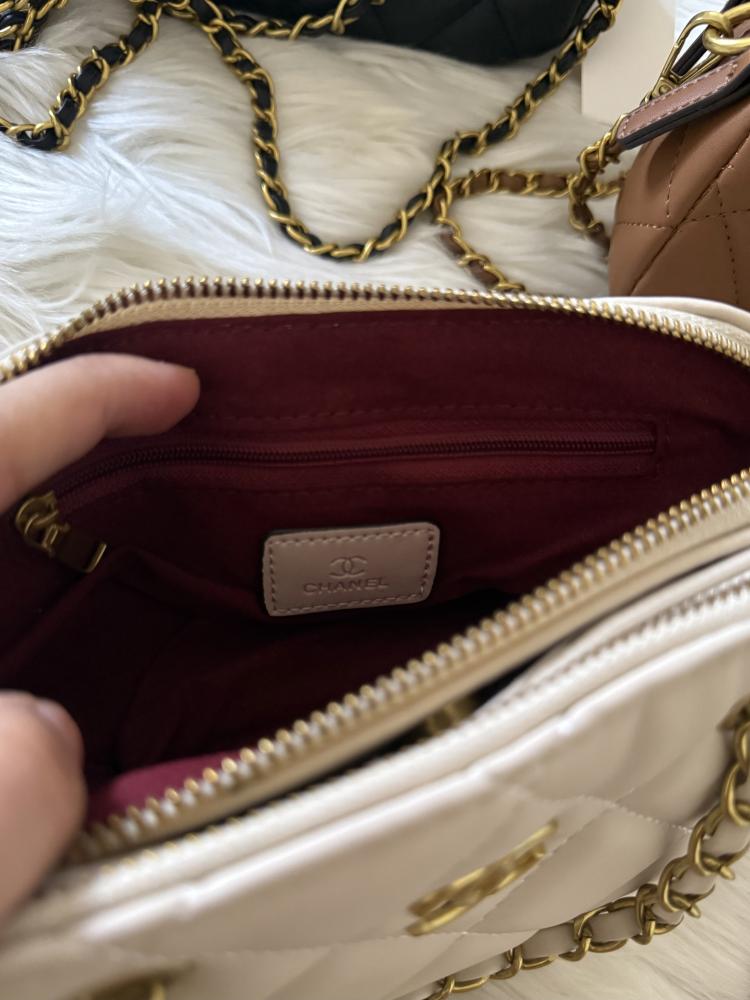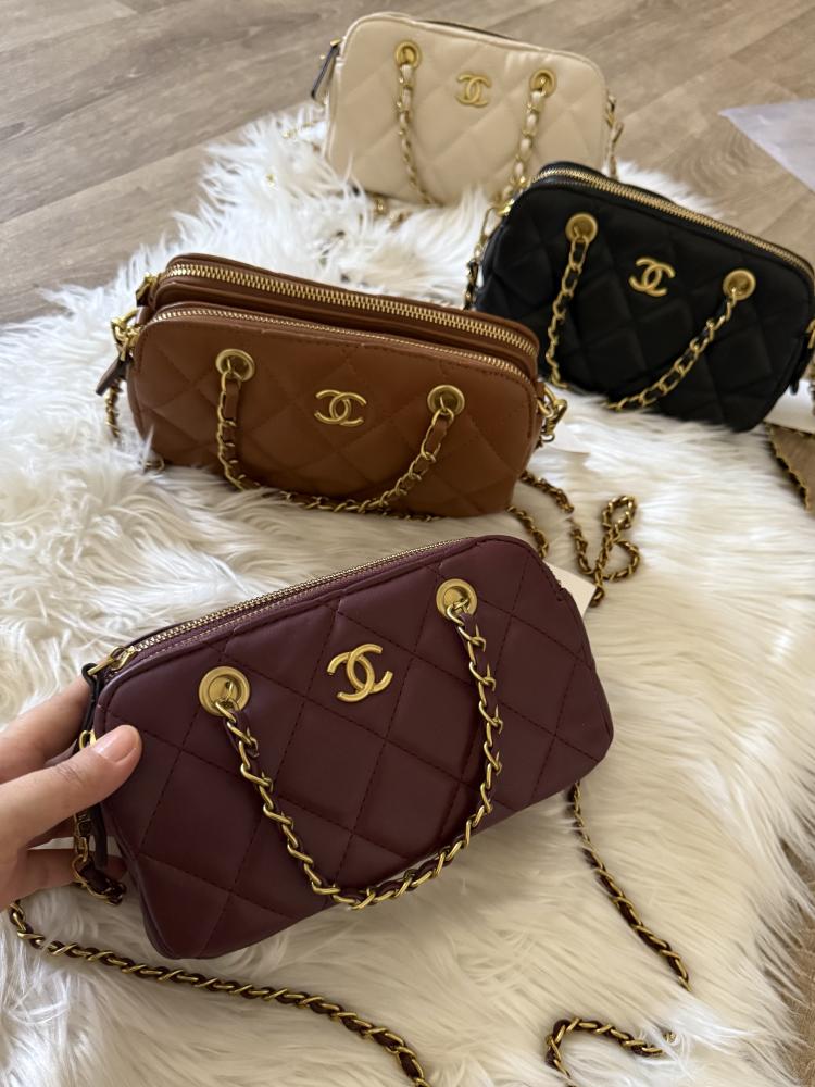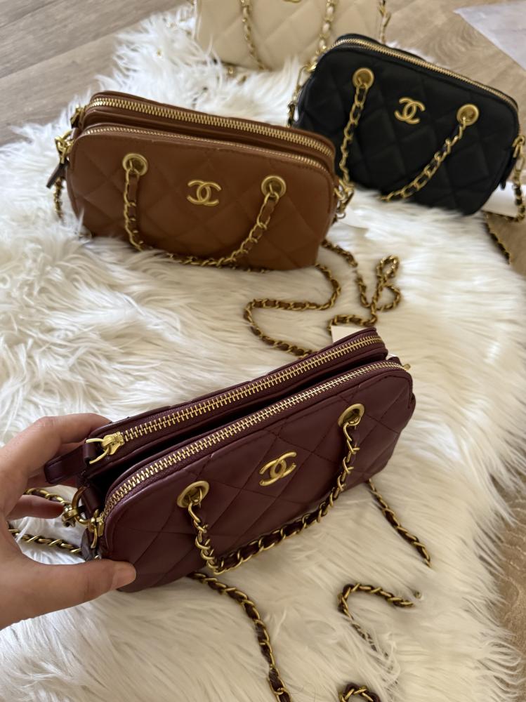 حقيبة شانيل فخمة تتميز بثلاث جيوب 2 سحاب وواحد طقطق + ستراب طويل